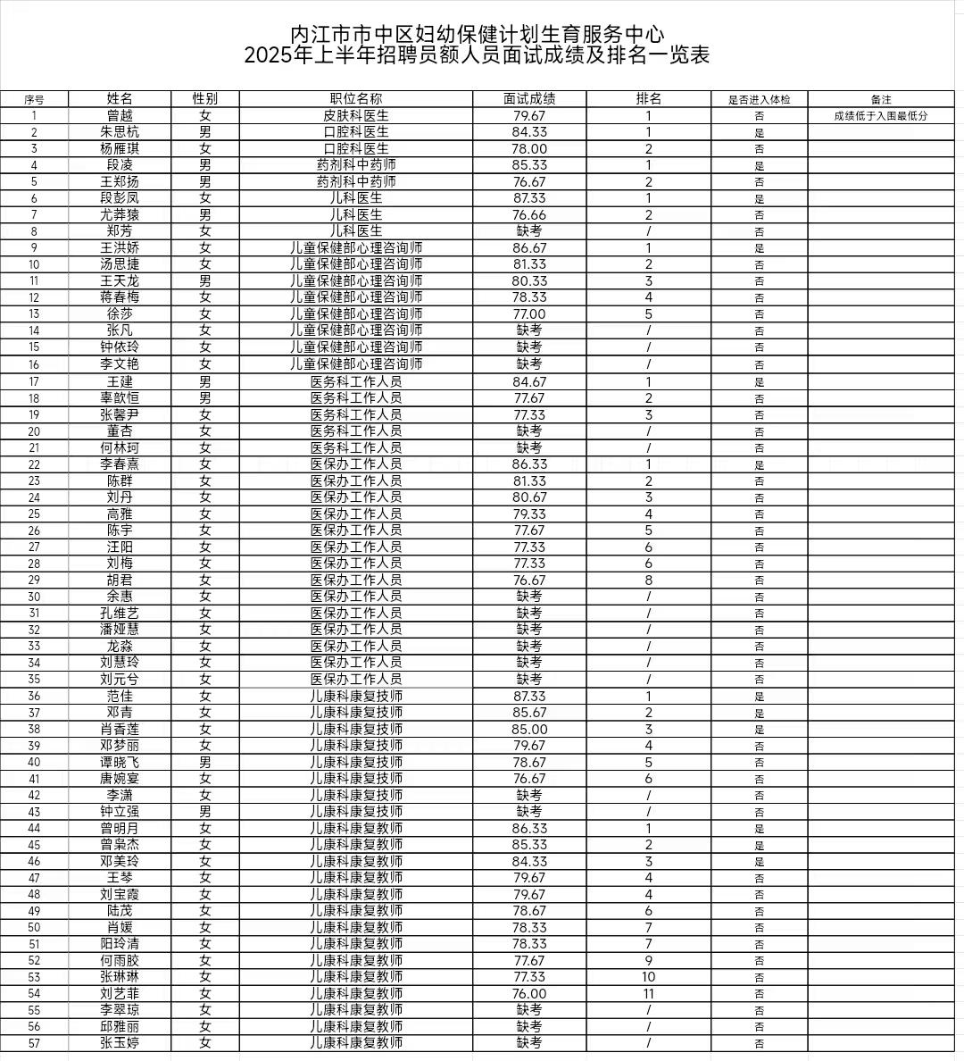 内江市市中区妇幼保健计划生育服务中心 关于2025年上半年招聘员额人员 面试成绩及排名的公示
